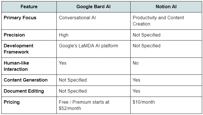 In the ever-expanding realm of AI-powered chatbots, it's prudent to explore alternatives for ChatGPT, each having its unique offerings. Below is a comparison of Google Bard AI and Notion AI, along with a comparison table highlighting their key features.