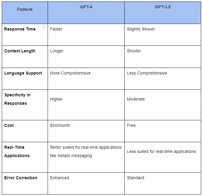 Ce tableau décrit les différences entre GPT-4 et GPT-3.5 qui sont particulièrement pertinentes pour les utilisateurs mobiles. Alors que GPT-4 offre des temps de réponse plus rapides et un support linguistique plus étendu, GPT-3.5 fournit une alternative robuste et gratuite. Les deux versions ont leurs mérites et leurs inconvénients lorsqu'elles sont utilisées sur des appareils mobiles, rendant le choix largement dépendant des besoins individuels et des cas d'utilisation.