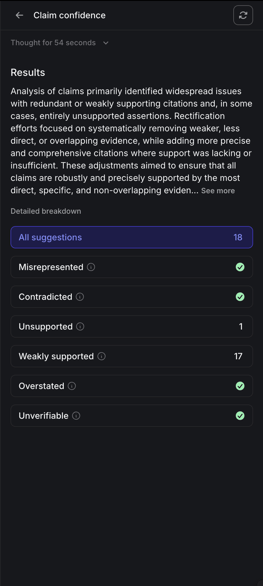 L'analyse de la confiance des affirmations a abordé les problèmes de citations redondantes, faibles ou manquantes, ainsi que les cas de contradiction dans les arguments de citation.