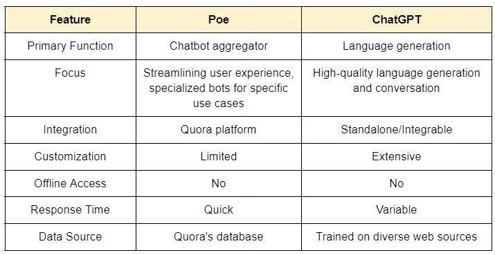 以下の表は、PoeとChatGPTの機能セットを要約しており、明確な比較スナップショットを提供します: