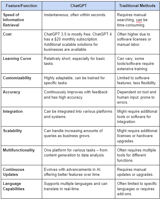 이 표는 ChatGPT가 기존 방법에 비해 가지는 우위를 한눈에 보여줍니다. 다기능성, 확장성 및 지속적인 진화 덕분에 ChatGPT는 비즈니스 도구 키트에서 필수적인 자산이 될 준비가 되어 있습니다.