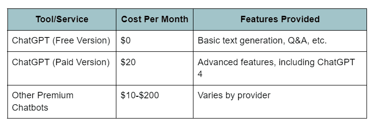 유사한 도구나 서비스와 비교했을 때, 채팅GPT는 상당한 비용 이점을 제공합니다. 더 전문화된 필요를 위한 유료 버전이 있지만, 채팅GPT 3.5의 무료 버전조차도 놀라울 정도로 강력합니다.